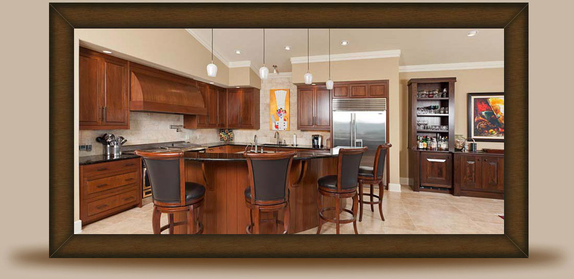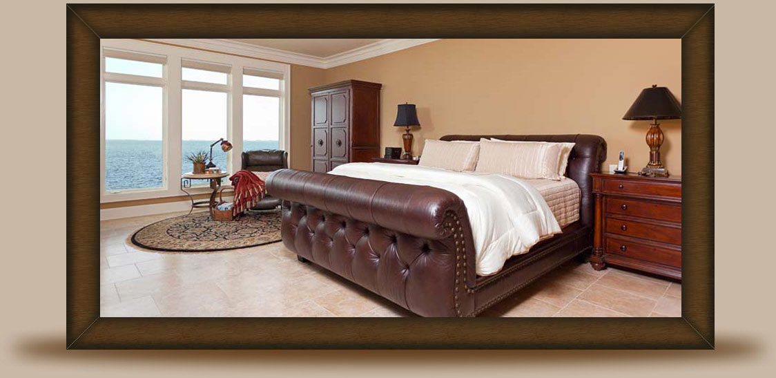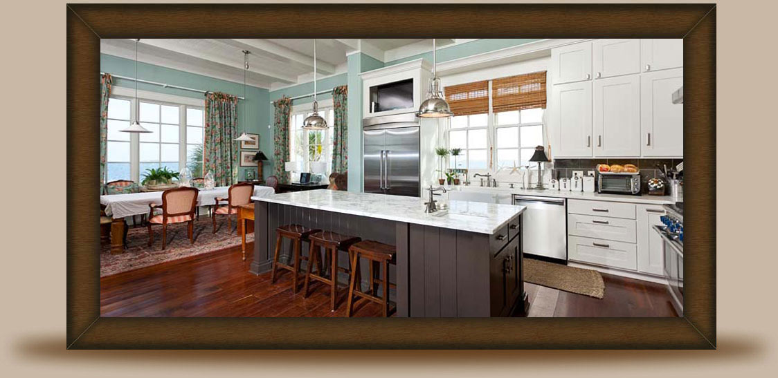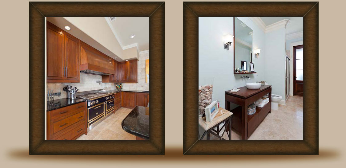 Also located on the water, the Modern Mediterranean is constructed on pre-stressed concrete pilings for increased stability. The exterior facade is an attractive hard-coat stucco, applied over concrete board. All exterior decking and stairways were constructed from South American ironwood – one of the hardest woods available. An open interior consists of ceramic tile flooring and warm mahogany cabinetry that encompasses a commercial kitchen for gourmet cooking and casual entertaining.